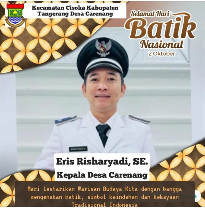 Tangerang – Kepala Desa Carenang Eris Risharyadi SE,. Yang juga sebagai Ketua APDESI Kecamatan Cisoka, Kabupaten Tangerang Mengucapkan Selamat Hari Batik Nasional, Jum’at, (03/10/2025)