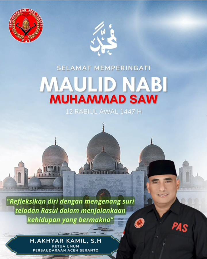 Ketua Umum Persaudaraan Aceh Seranto (PAS) H. Akhyar Kqmil SH,. menegaskan pentingnya meneladani sifat dan perilaku mulia Nabi Muhammad SAW dalam kehidupan sehari-hari, ia mengucapkan, “Selamat memperingati maulid Nabi Muhammad SAW 12 Rabiul Awal. 1447 Hijriah”.