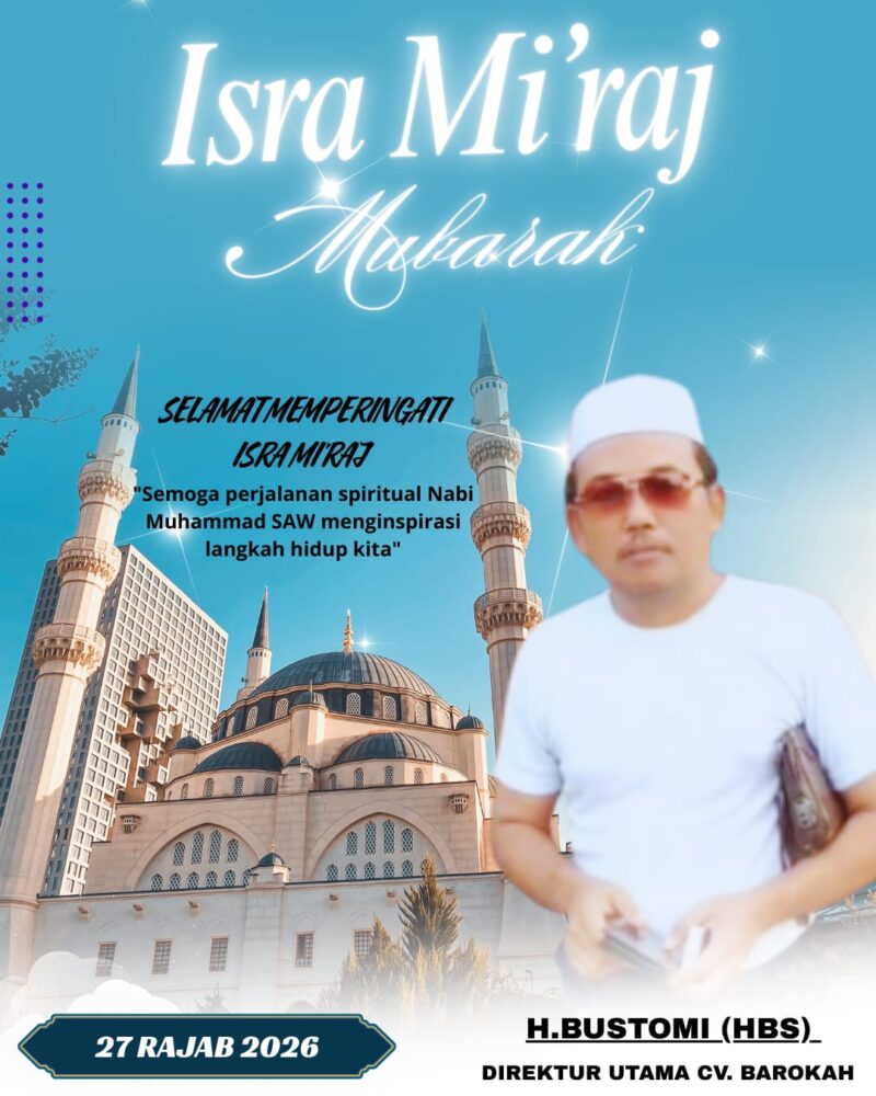 H. Bustomi Direktur Utama Cv. Barokah mengajak seluruh masyarakat menjadikan peringatan Isra Mi’raj sebagai sarana mempererat ukhuwah, menjaga kebersamaan, dan menciptakan kehidupan bermasyarakat yang religius dan harmonis.