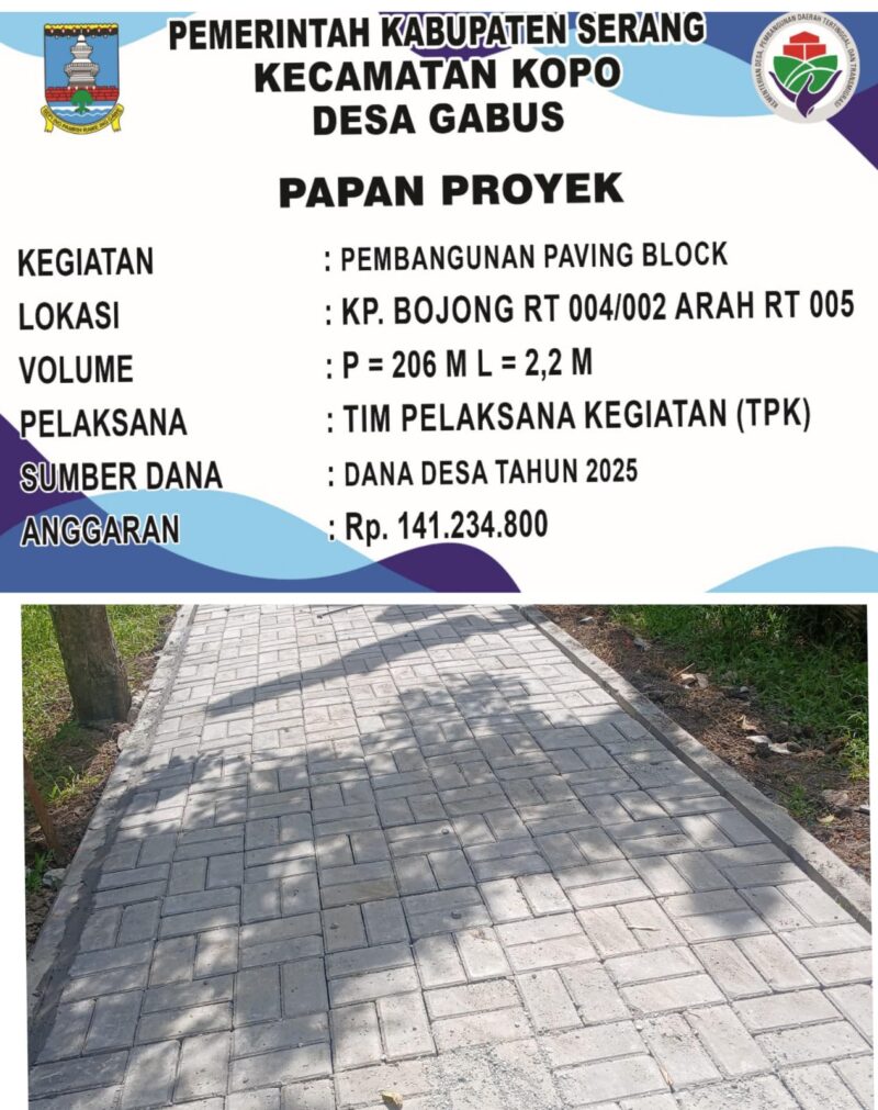 seperti halnya yang telah dilakukan oleh Pemerintah Desa Gabus, Kecamatan Kopo, Kabupaten Serang, Provinsi Banten, Diketahui Pihak Pemdes Gabus telah laksanakan kegiatan pembangunan infrastruktur dalam bentuk fisik jalan Paving Block dengan P. 206 M X L 2,2 M,. Sumber Dana, Dana Desa Tahun 2025, yang sedang di bangunkan tanpa suatu masalah, adapun anggaran biayai Rp. 141.234.800 (Seratus Empat Puluh Satu Juta, Dua Ratus Tiga Puluh Empat Ribu Delapan Ratus Rupiah)